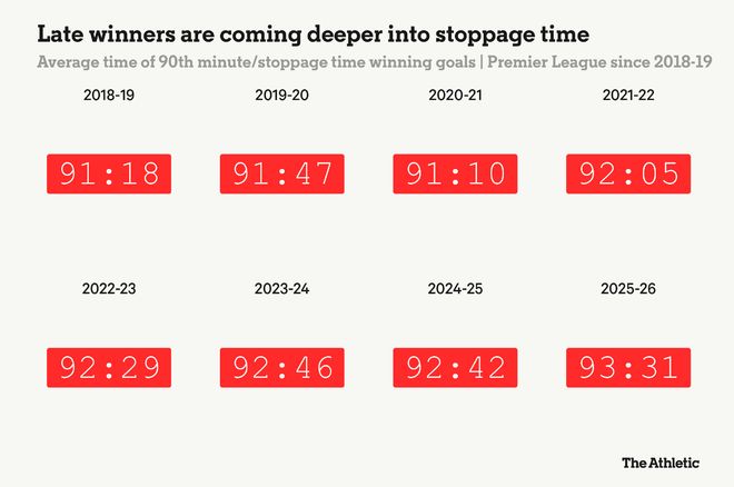 这一变化将决定性的时刻推得更晚。本赛季补时进球的平均时间出现在第93分31秒,这是过去八个英超赛季中最晚的一次。