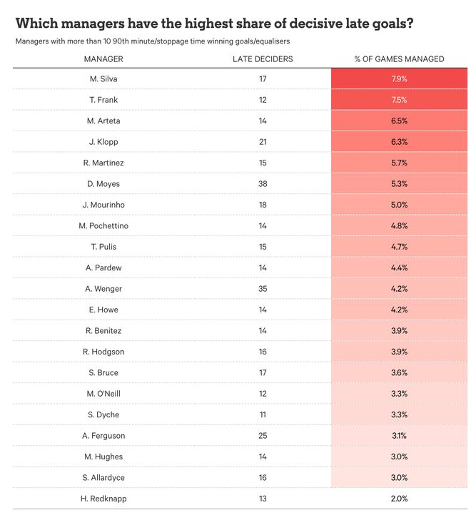 以下是所有拥有超过10个补时关键进球的教练名单。弗格森在总排名中位列第三,但这反映了他在810场英超比赛中执教的长久性;从百分比来看,他排在倒数第四。位居榜单前列的是马尔科-席尔瓦、托马斯-弗兰克和阿尔特塔三位现任英超主帅,这也进一步证明了我们确实正处于补时进球的时代。