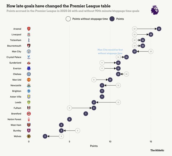 如果没有补时阶段,曼城本应高居榜首。如果他们能在与阿森纳的1-1战平中阻止加布里埃尔-马丁内利的补时扳平进球,他们还能多得两分。利物浦则在补时阶段接连以1-2输给了切尔西和水晶宫,但由于对阵纽卡斯尔联和伯恩利时的补时绝杀,他们的整体表现依然在补时阶段有所盈余。