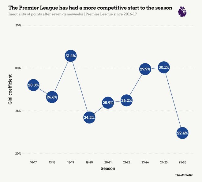 基尼系数值为100%意味着所有积分都集中在一支球队手中,而0则代表完全平等,每支球队积分相同。与过去九个赛季的前七轮相比,本赛季的竞争最为激烈,基尼系数仅为22%。更为激烈的联赛增加了比赛在最后阶段陷入胶着的可能性,为补时阶段的戏剧性转折创造了条件。