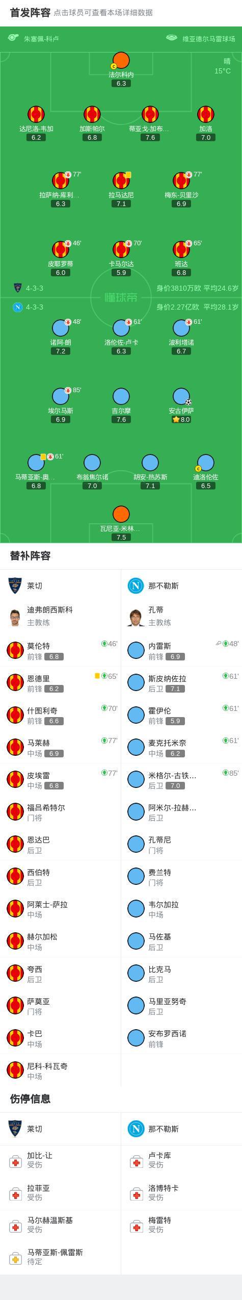 第69分钟,内雷斯开出任意球,安古伊萨头槌破门,那不勒斯1-0